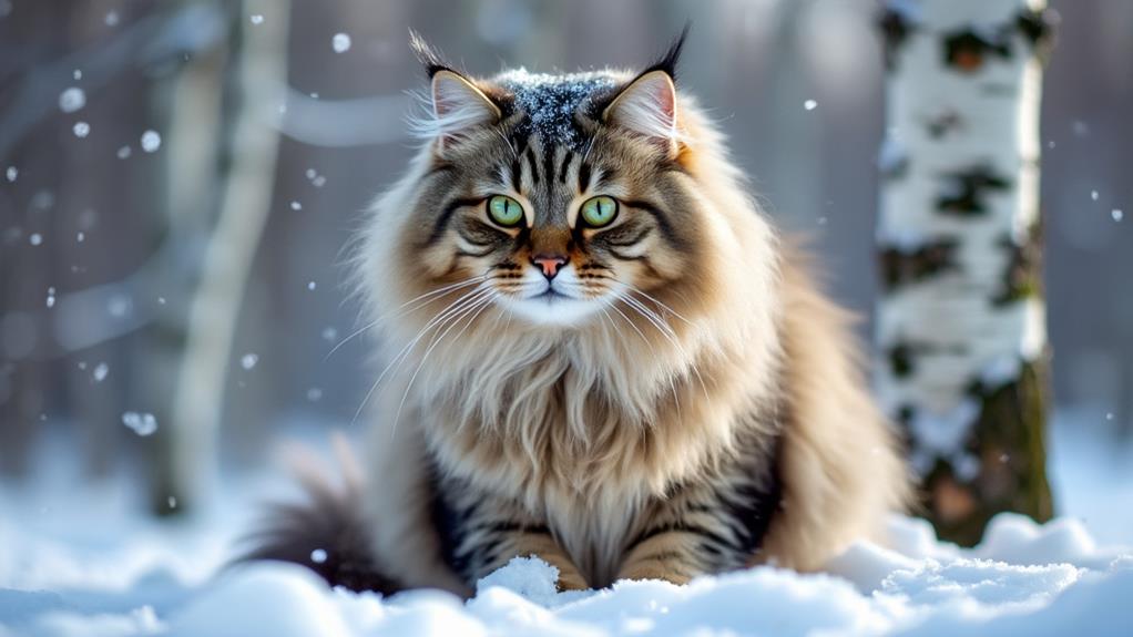 The Maine Coon, a majestic feline with a commanding presence, is one of the largest domestic cat breeds, often weighing between 10 to 25 pounds. Standing tall at up to 16 inches at the shoulder, these "gentle giants" are known for their friendly and sociable nature, making them great companions for families and other pets. You'll find their distinct tufted ears and bushy tails make them even more striking, but it's their large, expressive eyes that truly capture hearts. As cats with big eyes, they sport eye colors ranging from gold and green to copper.