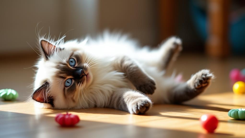 Often admired for their striking blue eyes, Ragdoll cats are an alluring breed that's sure to catch your attention. Their big eyes are one of the most enchanting features, making them stand out in any feline lineup. As you get to know this breed, you'll also notice their semi-long, silky coat. It's not just beautiful but also soft to the touch, though it does require regular grooming to keep its luxurious appearance intact.