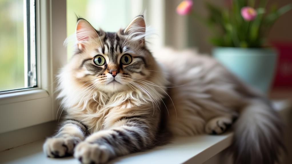 Renowned for their distinctive flat faces and striking round eyes, Persian cats captivate with their unique appearance. Those big eyes can be blue, green, or copper, adding to their enchanting allure. You can't help but notice their long, luxurious fur coats, which demand regular grooming to prevent matting and keep them looking their best.