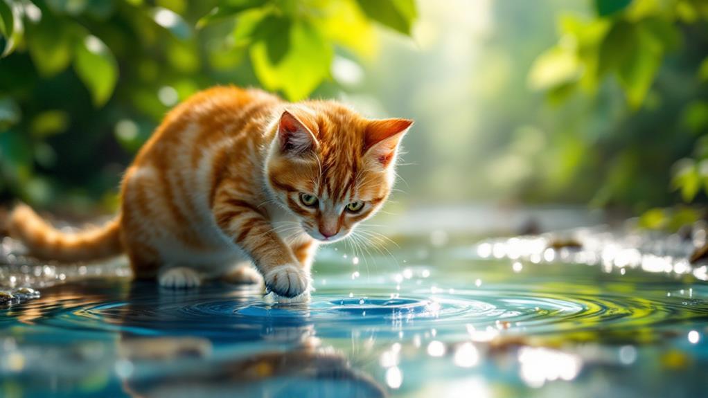 Cats' interactions with water can vary widely, demonstrating that individual preferences play a significant role. You might notice that some cats are fascinated by water, jumping at the chance to bat at droplets or splash around. Others, however, might avoid it entirely. Each cat's personal history influences their relationship with water. A cat that's had negative experiences might develop an aversion, leading to a fear reaction. Conversely, gradual exposure can help build positive associations, making them more comfortable over time.