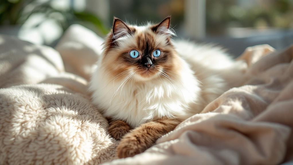 Additionally, be aware of potential genetic health issues like hemophilia. Before any surgical procedures, pre-surgical blood tests can assess your Birman's clotting ability, guaranteeing their safety. By focusing on these health aspects, you can assure your Birman enjoys a fulfilling and healthy life for many years.