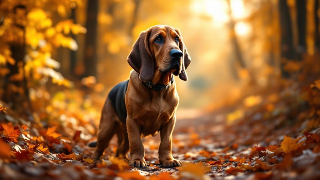 You'll find that Bloodhounds are a unique blend of friendliness and independence, making them both loving family pets and exceptional trackers. With their unmatched sense of smell, they can detect scents over 130 miles away. These dogs are gentle and laid-back but require consistent exercise and early training to manage their stubborn streak. Regular grooming is a must, especially with their long ears, and they often need about 4-8 cups of high-quality food daily. Keep an eye on their health with routine vet visits. Immerse yourself in more details to uncover how they can be perfect for your family dynamics.