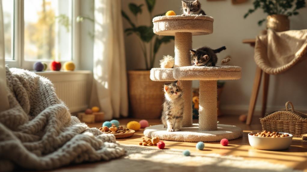 After setting up the perfect litter box, focus on creating a safe environment for your new kitten. Kitten safety is vital, as these curious creatures love to investigate. To guarantee your home is kitten-proofed, start by inspecting your windows. Secure windows and check that screens are intact to prevent falls from adventurous climbs. Next, you'll want to remove small items like coins and rubber bands, as they pose choking hazards.