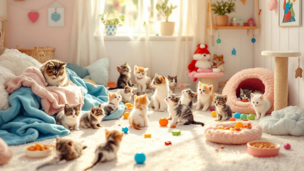 When it comes to feeding, adhere to a consistent feeding schedule. Kittens need frequent meals, so start with four meals a day, reducing to two or three as they grow. Confirm you're providing high-quality kitten food that meets AAFCO standards, offering balanced nutrition with nutrient-rich ingredients.