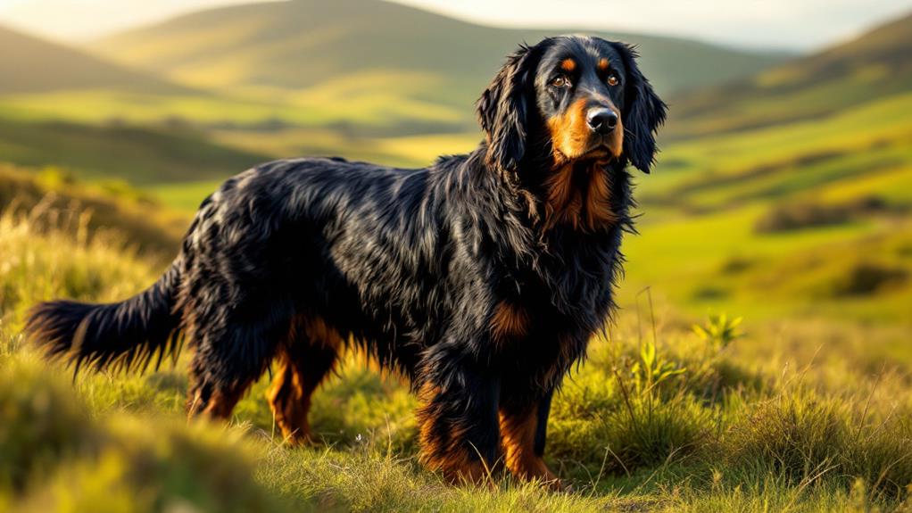 You'll love the Gordon Setter, a towering and loyal companion from Scotland's 17th century. Known as the "black avenger of the Highlands," this athletic dog is perfect for outdoor adventures and hunting pursuits. With males reaching up to 27 inches and weighing 80 pounds, they're a significant presence in any family. Their long, black coat with tan markings is striking but needs regular grooming. These setters are affectionate, bonding closely with family yet reserved with strangers. Guarantee early training, daily exercise, and groom their dense coat to keep them at their best. There's much more to uncover about this spirited breed.