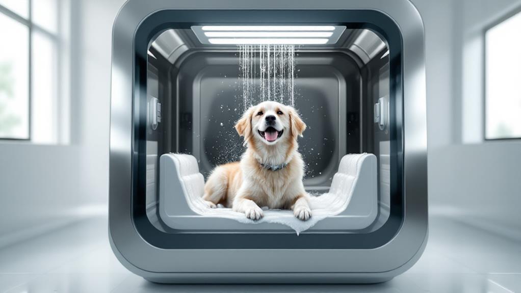 An automated dog washing machine revolutionizes your pet's grooming by offering a safe and efficient experience. You simply guide your dog into the tub, attach the secure collar, and select shampoo options from pet-safe choices. The system evenly dispenses warm water and shampoo over a 10-minute cycle, ensuring thorough cleaning. Built-in blow dryers then gently dry your dog's coat, reducing stress. These machines are user-friendly with safety features like non-skid platforms and ADA-approved designs. With extra features like conditioners and flea washes, you'll find it's tailored to diverse pet care needs. There's more to uncover about these cutting-edge machines.