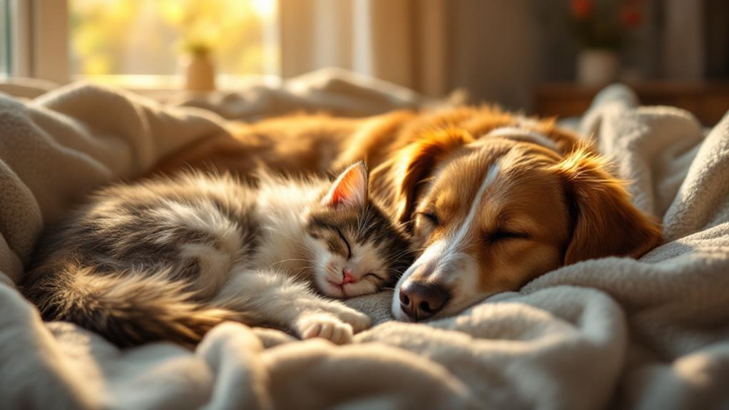 Recognizing body language is key. Watch for warning signs like raised hackles in dogs or pinned ears in cats, as they indicate discomfort and stress. Timely intervention can prevent escalation and help your dog and cat get along. Understanding these dynamics guarantees a harmonious household where all pets feel safe and secure.