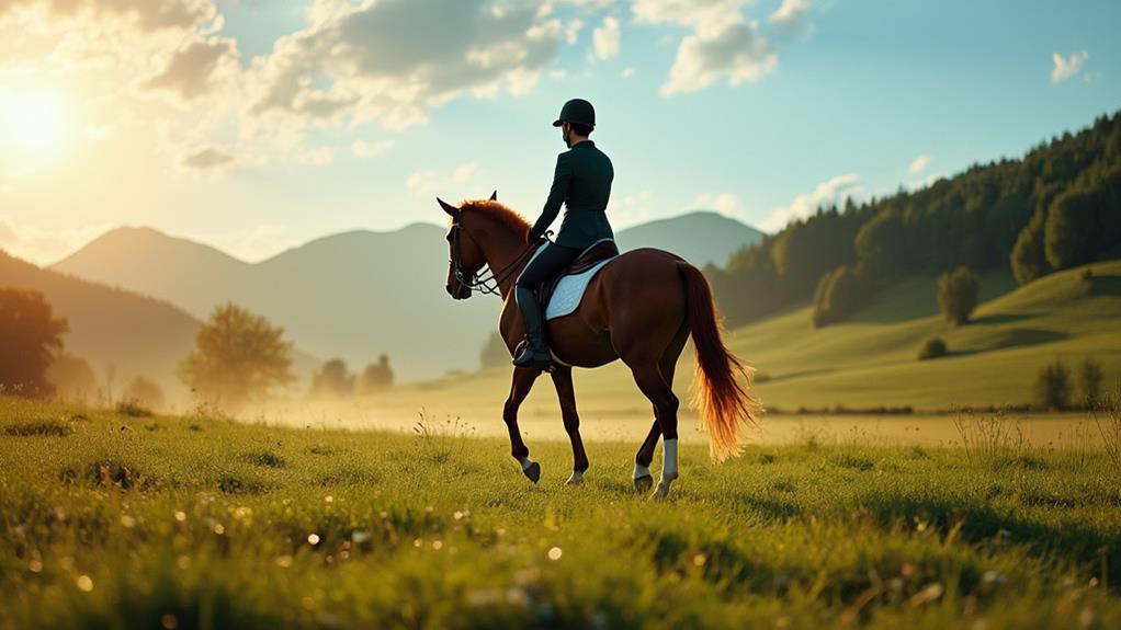 Taking care of yourself is just as fundamental as honing your horse riding skills. Prioritizing self-care guarantees you're in top condition, similar to professional athletes. Regular health check-ups and a balanced diet keep your body ready for the physical demands of riding. Implement a fitness routine that combines cardio, strength training, and flexibility exercises like yoga. This approach boosts your endurance and riding skills, helping you maintain control and poise in the saddle.