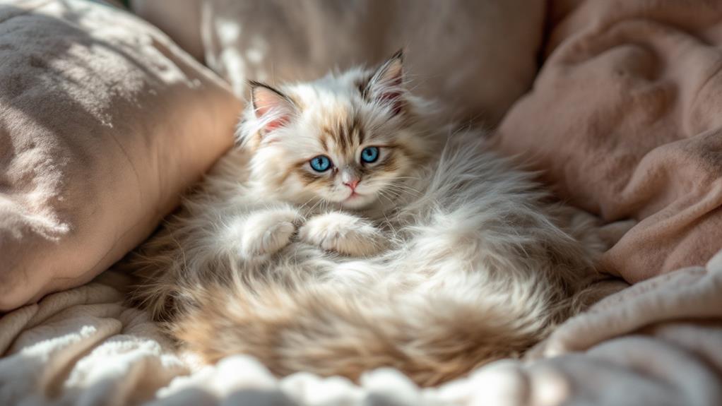 Additionally, Minuet cats can experience skin problems, such as allergies causing itchy skin. Regular grooming is key to reduce allergens and irritants, keeping their coat and skin in peak condition. Making sure that your Minuet cat receives a balanced diet not only supports their comprehensive health but also helps manage these skin concerns. By addressing these health issues proactively, you can guarantee a long, fulfilling life for your feline companion.