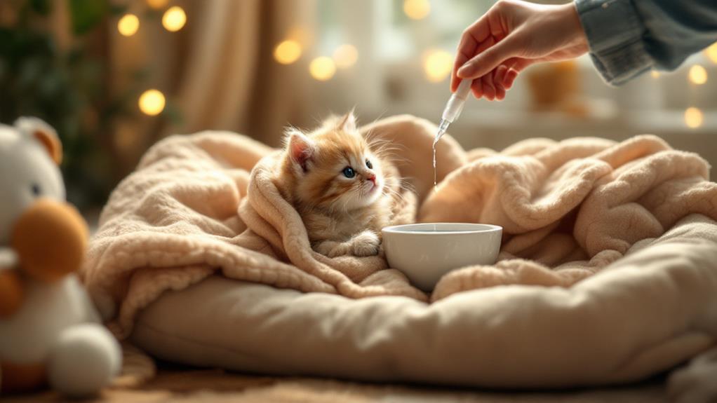 Proper nutrition is another important aspect of your kitten's health. Discuss dietary needs with your vet, who can recommend high-quality kitten food that supports their rapid growth and development. Keep a close eye on their food and water intake to verify they're thriving.