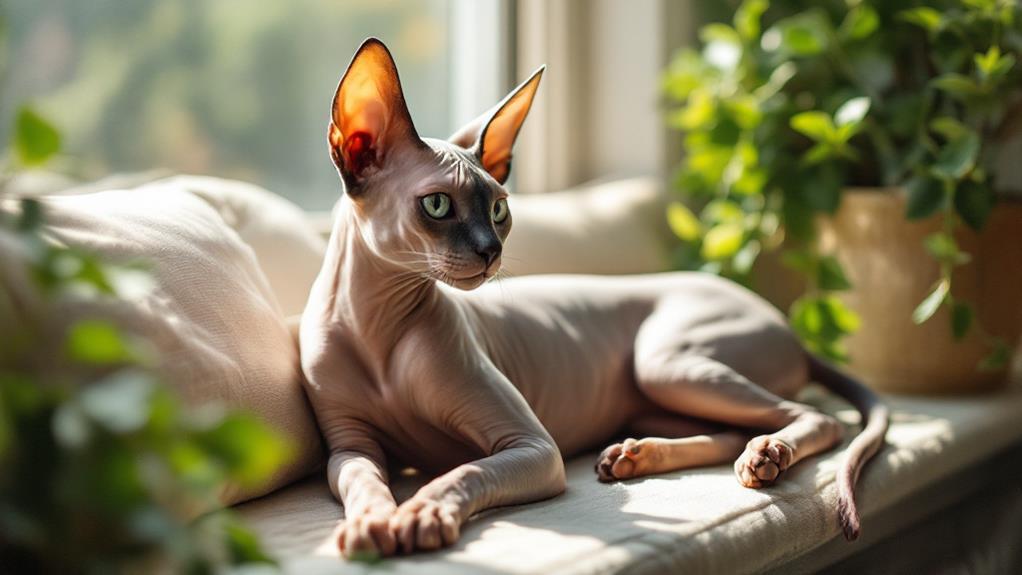 Meet the Peterbald cat, a charming and spirited breed originating from St. Petersburg, Russia in 1994. This hairless feline combines a unique look with a warm heart, thriving on affection and interaction. Their long, lean bodies and oversized ears give them a striking appearance, while their playful and social nature makes them ideal companions. Despite needing special care for their sensitive skin, their vocal and energetic temperament keeps you thoroughly entertained. They fit well in households with other pets and children, providing endless joy with their perky personality. Investigate more to uncover their intriguing traits and care necessities.