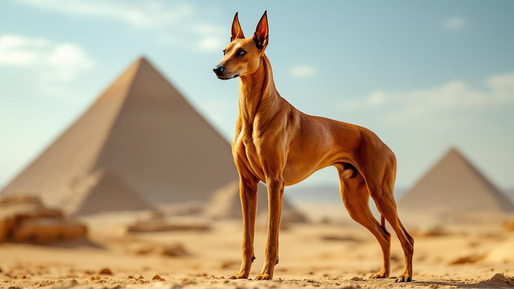 You'll find the Pharaoh Hound both noble and athletic, with roots stretching over 5,000 years back to ancient Malta. Recognized for its distinct "blushing" trait and amber eyes, this medium-sized hound stands 21-25 inches tall and weighs between 45-55 pounds. Known for loyalty, it thrives on companionship and has a friendly, intelligent demeanor making it great with families. Originally bred for hunting, it needs two hours of exercise daily. While it has minimal grooming needs, monitor its health to prevent issues like luxating patellas. There's much more to uncover about this ancient and intriguing breed.
