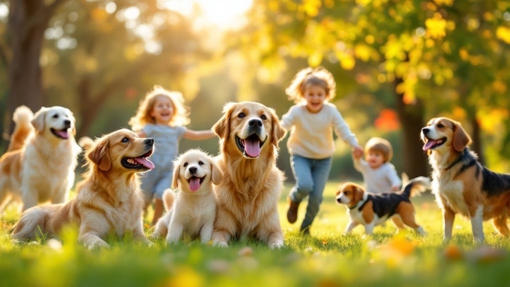 Golden Retrievers, known for their gentle temperament and love for play, are another fantastic choice. They engage well with children, making them a perfect fit for families with young kids. Their ability to adapt to different household environments guarantees they blend seamlessly into your home.