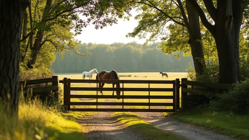 You'll need at least 2 acres of well-maintained land per horse to guarantee they have enough space for grazing and exercise. Choose land that's free of hazards like sharp objects and toxic plants. Good soil quality and drainage are essential for healthy pastures. Secure fencing with a height of at least 5 feet is needed to keep your horses safe, while reliable water sources are critical, as horses drink up to 24 gallons daily in hot weather. Don't forget a sturdy shelter to protect them from harsh weather. There's more to uncover about creating the ideal environment for your horses.