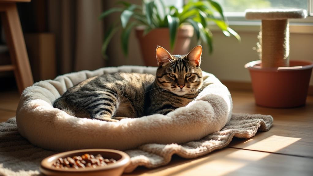 As your cat matures, you'll notice they may need more emotional support and attention to stay content. Senior cats often experience anxiety and behavioral changes due to aging. To help them feel secure, establish predictable daily routines. This consistency provides comfort and reduces stress, promoting your cat's general well-being. Avoid introducing energetic kittens into the home, as their rambunctious nature can overwhelm your senior cat, increasing their anxiety and stress levels.