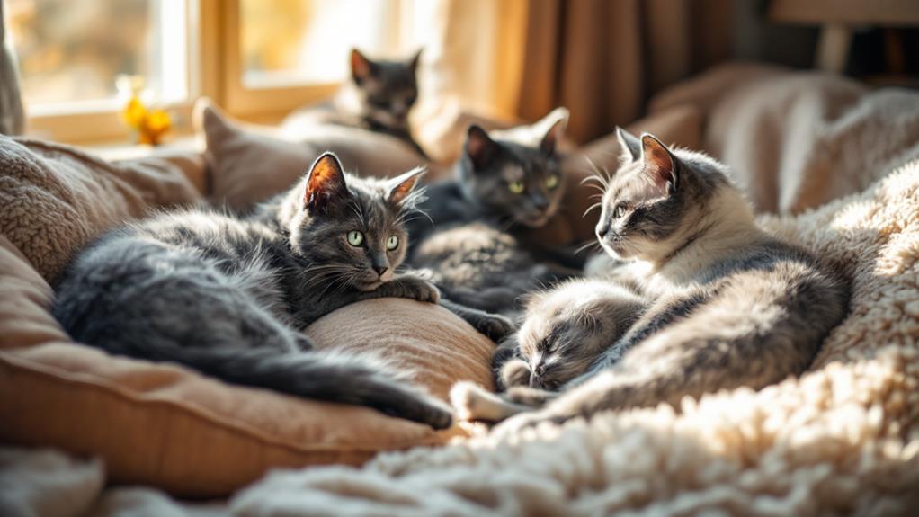 Temperature extremes pose another challenge. Without fur, hairless cats are sensitive to both cold and heat. Guarantee they have cozy environments to thrive in, protecting them from harmful UV rays that can cause sunburn. Providing warm clothes or blankets can help them stay comfortable.