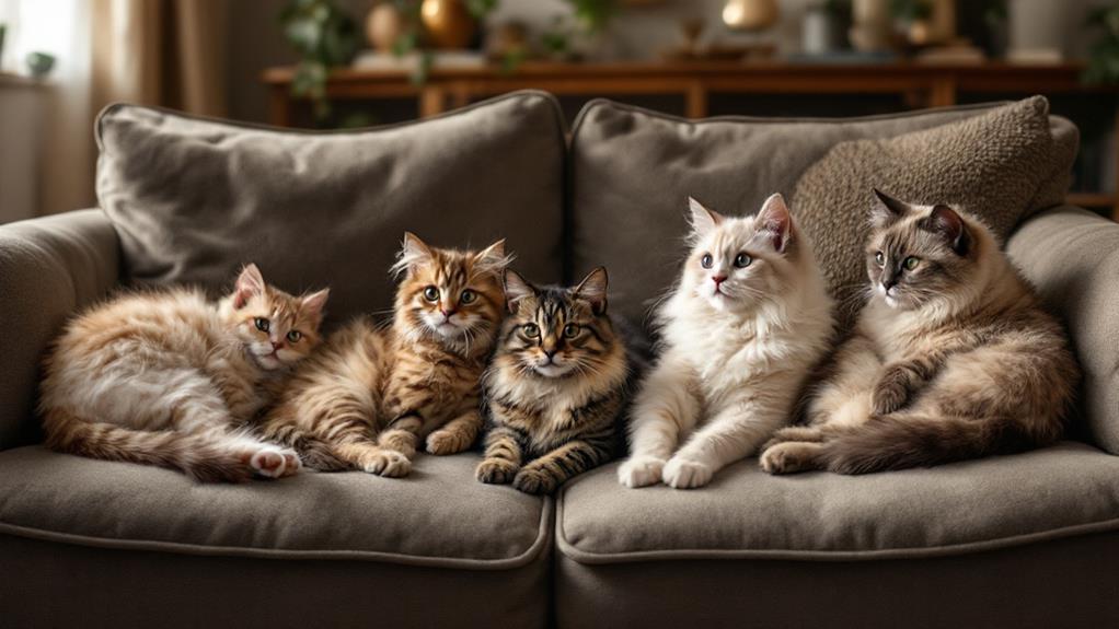 Interestingly, this same mutation can cause curly or wavy fur in other species like dogs and rodents. Understanding these genetic nuances helps guarantee that hairless breeds maintain their health and unique appearance through careful breeding choices. As you plunge deeper into the world of hairless cats, you'll appreciate the complex science behind their creation.